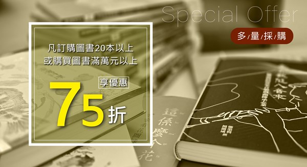 凡購買圖書(選擇性)20本以上或定價購買足滿萬元以上,即享75折優惠。 (本優惠折扣無法與其他優惠套餐計算,欲購買其他單元商品另請分單下訂)