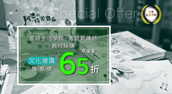 歡迎擁有客語生活學校或客語薪傳師認證之學校與教師,購買本商城圖書做為教材,可享文化推廣優惠65折