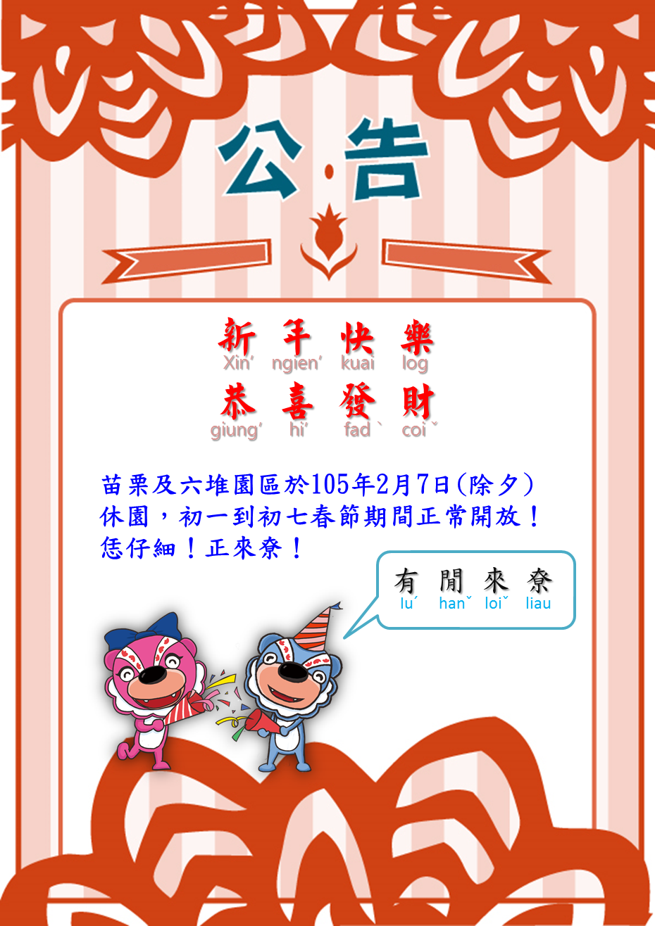 - 1508 【園區公告】苗栗園區於105年2月7日(除夕)休園,初一到初七春節期間正常開放! 恁仔細!正來尞!